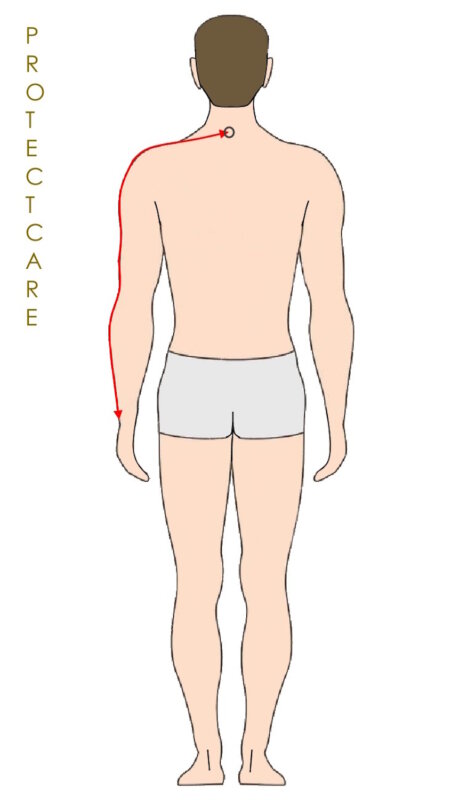 Meet vanaf nekknobbeltje over schouder, zie onderstaande afbeelding.